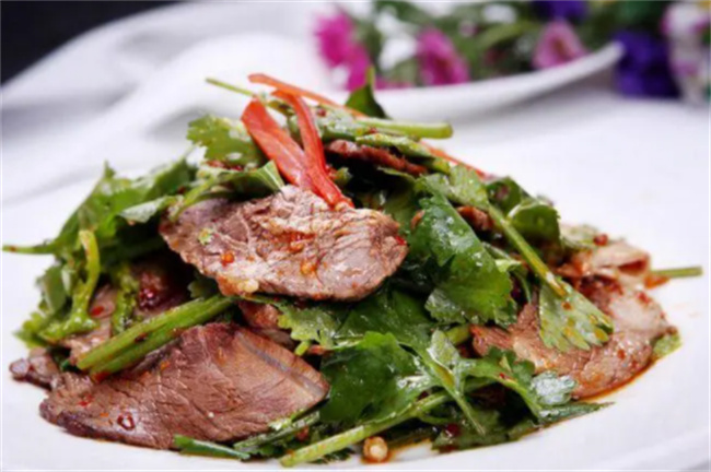 五、香菜拌牛肉 1.将牛肉切薄片,加入调料腌制后焯水煮熟。 2.将香菜切段,将蒜末、小米椒碎、熟芝麻、辣椒面放入碗中,加入烧热的油激发香味,再加入调料搅拌均匀。 3.将牛肉片和香菜放在一起,混合均匀后即可享用。