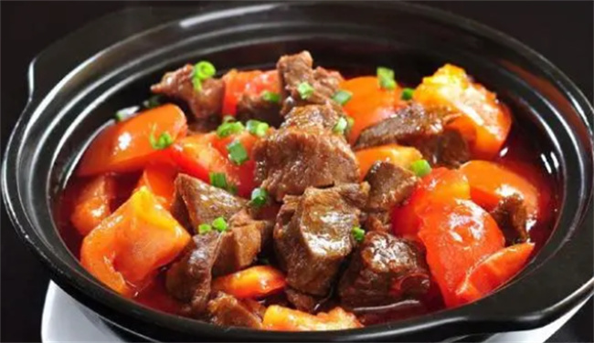 二、番茄炖牛腩 1、准备所需的食材牛腩2斤,番茄4个,胡萝卜2根,花椒、大料、葱、姜、八角各适量。 2、将牛腩切块后焯烫,并将洗净的番茄切成块备用。 3、在一个砂锅里加入白开水,将胡萝卜块和切成块的牛肉一起煮,加入葱、姜、八角、花椒和大料等调料,随后加入番茄块。 4、炖煮至牛肉和胡萝卜软烂,食用时可以根据口感再进行适当调味。