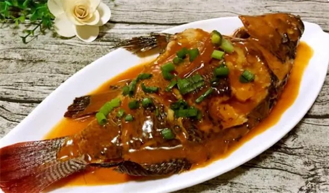 NO.2 红烧罗非鱼 准备食材如下:罗非鱼1条,色拉油1小勺,食盐1茶匙,醋1汤匙,葱1根,姜1块,老抽1茶匙,白糖1茶匙,水适量,红尖椒2个 具体做法如下:先将罗非鱼洗净,在罗非鱼表面涂上料酒食盐备用,调个红烧汁(醋、砂糖、盐、老抽、清水)搅拌均匀备用。起锅加油烧热,放入罗非鱼煎至两面焦黄、放入葱段和姜丝小火爆香,倒入然后倒入红烧汁,盖上锅盖,双面各烧5分钟后开盖收浓汤汁(约2分钟),即可出锅装盘!
