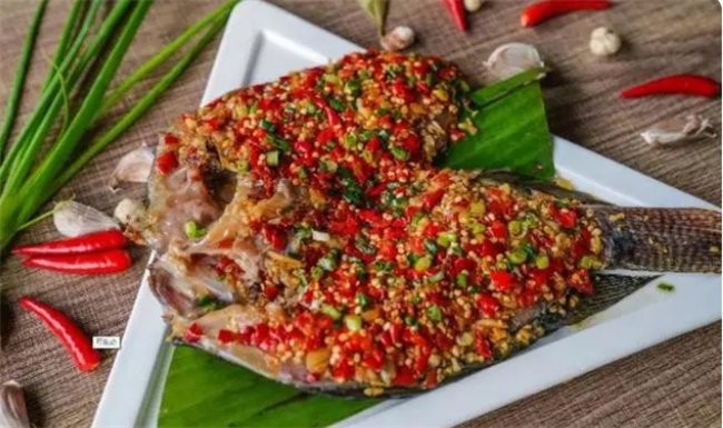 NO.5 剁椒罗非鱼 准备食材如下:罗非鱼1条,食盐1茶匙,姜1块,蒜5瓣,调和油适量,胡椒粉1茶匙,剁椒半碗 具体做法如下:罗非鱼全身用盐及胡椒粉抹匀,铺上姜丝。再放上蒜末和剁椒腌制20分钟。锅里水烧开放鱼入锅,蒸7分钟后不开盖再虚蒸3分钟。锅里烧热油,倒在鱼身上即可。