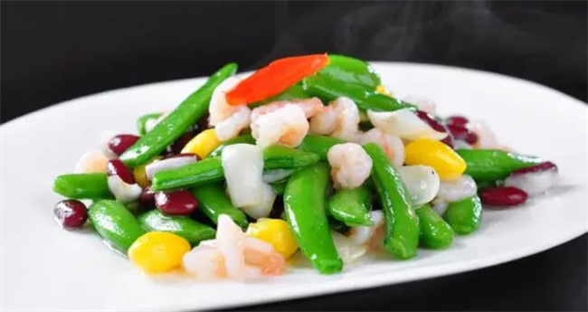 NO.3 虾仁炒荷兰豆 准备食材如下:虾仁500克,荷兰豆300克,色拉油适量,食盐5克,姜适量,料酒20毫升,小葱5克 详细做法如下:虾仁剥皮去虾线,洗干净,荷兰豆择去两边的长丝,洗净,焯一下,控干水,锅内放少许油,炒香姜片,下入虾仁,下入葱花,盐,料酒,炒匀到虾基本变色,倒入焯过的荷兰豆,炒匀,出锅!