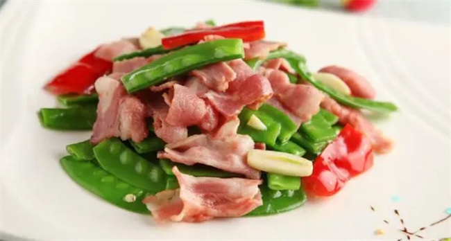 NO.4 培根炒荷兰豆 准备食材如下:荷兰豆适量,培根3片,红椒1个,色拉油适量,食盐少许,鸡精2克,蒜5瓣 具体做法如下:准备材料。荷兰豆去两头的梗,顺带剥下老筋,洗净备用,培根切削片,红椒切块、蒜切碎待用,将荷兰豆放入加了盐的开水中绰水约20秒,马上捞出来放入冰水中,锅里放少许油(培根还会出油,所以油少放一点即可),将培根片和蒜末放入煸香,待培根变色后加入红椒煸炒一小会(注意培根不要炒的太老了,否则硬了口感会差些),再加入沥干水分的荷兰豆,快炒约2分钟左右后调入适量盐和鸡精翻炒均匀即可!