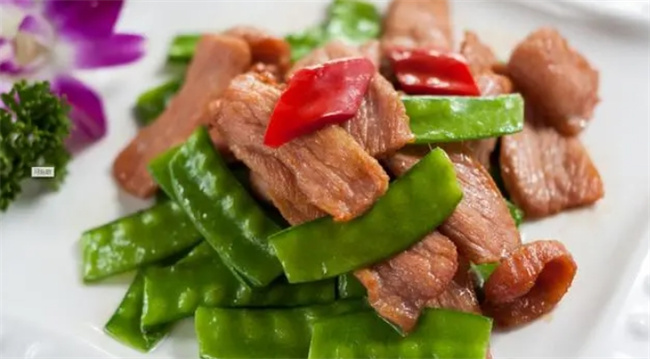 NO.5 荷兰豆炒牛肉片 准备食材如下:牛里脊200克,荷兰豆250克,食盐3克,葱适量,料酒1茶匙,生抽2茶匙,蚝油2汤匙,淀粉1茶匙,植物油3汤匙 具体做法如下:将甜豆择去老筋洗净,放入滚水中汆烫断生,捞出后放入冷水中浸泡,待完全冷却后再捞出沥干水分。牛里脊切片,用生抽、干淀粉和料酒抓拌均匀,腌制10分钟。大葱洗净后切片。炒锅中倒入油,待油7成热时,放入牛肉片滑炒至8成熟,之后放入甜豆,调入蚝油2汤匙(30毫升)和盐,翻炒至熟即可。
