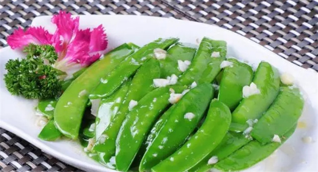 NO.2 蒜蓉荷兰豆 准备食材如下:荷兰豆500克,食盐1茶匙,蒜5瓣,水适量,植物油少量 具体做法如下:首先把荷兰豆去蒂去丝,然后清洗干净,接着把大蒜拍扁剁成蒜末,起锅加油烧热,油温5成热时,把蒜末放锅里小火爆香,然后把洗净的荷兰豆倒入锅中,加入1茶匙食盐,然后转成大火快速翻炒,翻炒1分钟后,加入1/3碗清水,然后盖上锅盖焖煮一会,开盖后再翻炒几下即可出锅!
