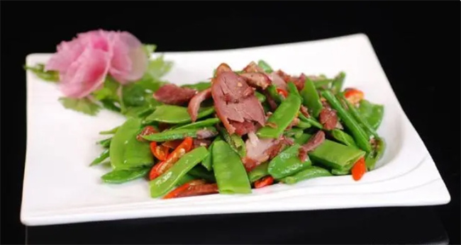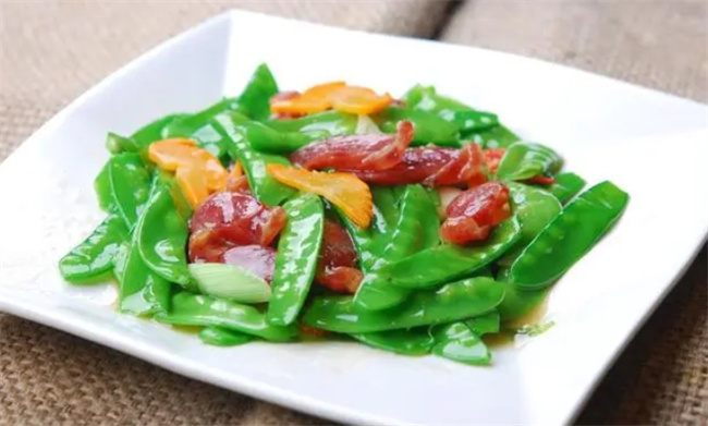 NO.1 荷兰豆炒腊肠 准备食材如下:荷兰豆200克,腊肠1根,食盐半小匙,鸡精半小匙,蒜2瓣,橄榄油2大匙 具体做法如下:荷兰豆洗净、腊肠切成薄片、蒜切片,平底锅放橄榄油,放入切好的蒜片和腊肠,出味后放入荷兰豆,待荷兰豆变绿后放入黑胡椒翻炒,加入盐调味,煸炒3—5分钟后加入鸡精出锅即可!