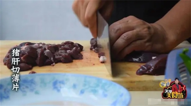 食材准备好之后,我们先来处理猪肝,猪肝买回来之后,我们放到水盆清洗干净,然后用刀切去筋膜,分成长条,再切成薄片!