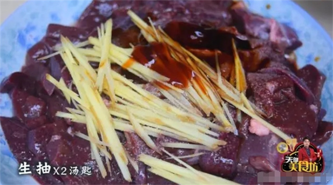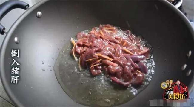 接下来,我们起锅加入2小汤勺的食油,烧至5成热,然后把腌制好的猪肝倒入锅中,转成大火,快速翻炒,把猪肝炒至5成熟!注意:是炒到5成熟,而不是全熟,火候掌握好炒出来的猪肝才会更加的滑嫩哦!