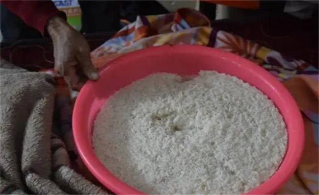 接下来是最重要的步骤了,大家一定要记住,等糯米饭和煲的水基本放凉之后,我们把捣碎的酒饼粉末撒到糯米饭上面,然后用你干净的小手捞匀,捞匀之后,我们加入凉白开,一边加入,一边搅拌,直到把所有的糯米饭都拆分成一粒一粒又不会水分太多,弄好之后,我们把糯米饭铺平,再在糯米饭的中间挖个洞,这样可以使糯米饭发酵成酒的时候更加的均匀!
