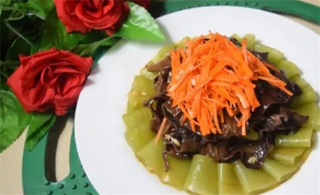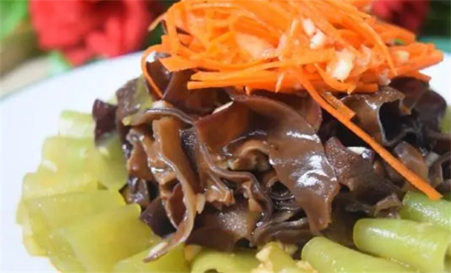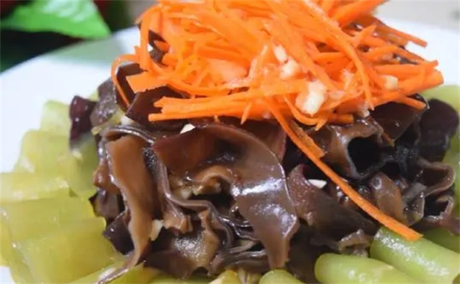 腌制15分钟左右,基本就入味了,接下来我们来摆个盘,准备一个又大又薄的盘子,先把莴笋夹出来,然后对叠,再一块一块的在盘子里面围成一个圈,围好圈之后,再把木耳放到莴笋圈中间。接着,把刚刚切好的胡萝卜丝,放到刚刚拌过木耳和莴笋的汤碗里面,搅拌上味,然后夹放到木耳的上方!