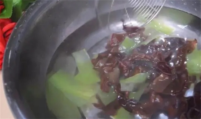 木耳和莴笋是因为比较薄,所以熟得也快,焯熟之后,马上用漏勺捞起来,然后过凉水,快速降温!这里说明一下啊,过凉水可以使刚焯熟的莴笋和木耳快速的降温,能够最大程度的保持食材颜色的鲜艳度!过凉水,最好用井水或者纯净水!过凉后,再次用漏勺捞起,稍微的沥干水分后,装盘备用!