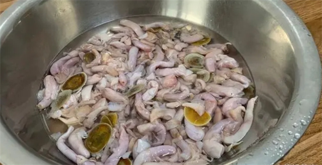 【韭菜炒海螺头】 1、买回来的海螺头里会掺杂一些硬硬的小圆片,海螺休息或者遇到危险时会用它把壳封闭起来,用来保护海螺的安全,这个小圆片叫作海螺厣。我们要把这些厣拣出来,然后用清水多清洗几遍,再捞出来控干水分备用。2、择好的韭菜放进盛有清水的盆中,再往里加入食盐和纯碱浸泡十五分钟左右,食盐和纯碱能够杀菌消毒并且去除韭菜上的一部分农药残留。之后再用清水冲洗干净即可,浸泡后的韭菜也更容易清洗掉上面的尘土杂质。然后把洗净的韭菜放到案板上切成段备用。