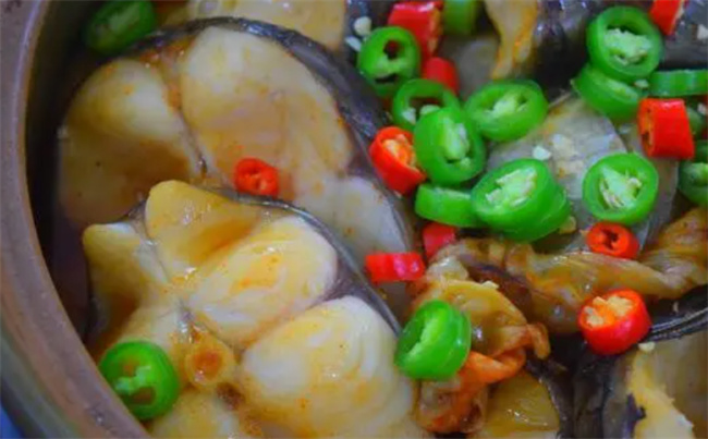 2. 起砂锅,加油烧热,放入姜片和蒜片,小火炒香后放入洋葱,再放入金针菇,用筷子翻拌均匀。接着将腌好的草鱼块摆入锅中,淋入剩下的料汁和少许的料酒,盖上锅盖,小火焖煮35分钟。 3. 在草鱼变熟的时候,撒入青红椒圈,再盖上盖子,焖煮2分钟即可上桌开吃!