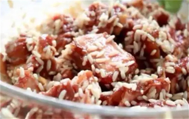 处理好食材之后,需要把所有的食材结合在一起,并调味,具体操作如下: 先把排骨腌制一下,加入生姜片,加入1汤匙的料酒,加入少许老抽,加入少许生抽,加入1汤匙的五香粉,加入少许糖,加入少许食盐,搅拌均匀!(这个步骤可以在泡糯米的时候进行)排骨调好味之后,加入切碎的香菇和泡发的糯米,然后搅拌均匀,搁置10分钟! 搁置10分钟后,混合好食材的排骨,会粘上很多的糯米粒。这时就可以装到蒸笼里了,先把泡软的荷叶摆在蒸笼的底层,然后把排骨一块一块的摆到荷叶里面!