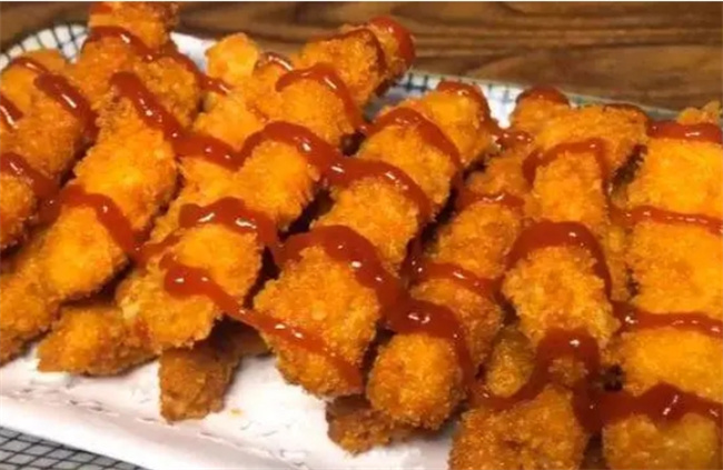 鸡柳弄好之后,起口干净的锅,加入食油,油温烧至100°C左右,再把鸡柳一条一条的放到锅里炸,炸到表面略微金黄色,然后把鸡柳捞起。继续把油烧热到100°C左右,然后把刚刚炸过的鸡柳再倒回锅里稍微炸一下就马上捞起!鸡柳炸好之后,就可以装盘啦,可以适当的加上一层番茄酱或者沙拉酱,味道会更赞哦!