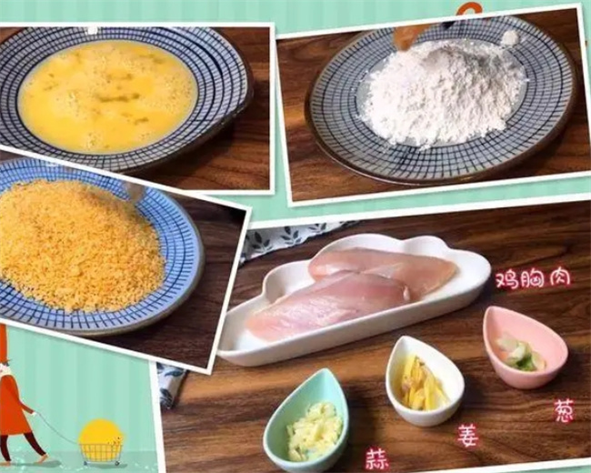 首先准备食材: 鸡胸肉 X 500g 面包糠 X 适量 鸡蛋 X 2个(打成蛋液) 面粉 X 适量 葱姜蒜 X 少许 生抽,食盐,黑胡椒粉,料酒 X 适量 番茄酱 X 适量