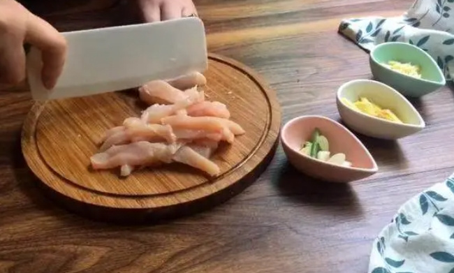 所有的食材都准备好之后,把鸡胸肉切成片,再切成条,然后装在一个大容器里面,加入葱,姜片,蒜片各少许,再加入1小茶匙食盐,1汤匙生抽,1小茶匙黑胡椒粉,1汤匙料酒,然后搅拌均匀,腌制30分钟!