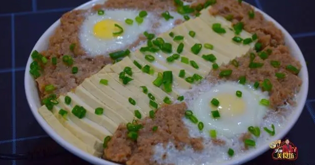 第一步:将豆腐用清水冲洗一遍,然后捞出来控干表面的水分,再用菜刀切成约2毫米厚的薄片,整齐地摆到一个蒸盘里面,备用。 第二步:将五花肉清洗干净之后,去皮,再切成小块,然后剁成肉末,装入到一个较大的盆里面,再加入1茶匙食盐,加入2汤匙生抽,加入2汤匙蚝油,加入1汤匙胡椒粉,加入20克淀粉,加入1小勺花生油,然后用筷子顺时针搅拌均匀,搅拌至肉末起胶即可。 第三步:将调好味道的肉末,用勺子均匀地盛入摆上豆腐的盘子,放在豆腐的两边,然后用勺子将肉末铺平。 第四步:等肉末铺平之后,用勺子在肉末上面挤出2个小凹口,然后在每个小凹口上面,各打入一只鸡蛋。 第五步:起蒸锅,等蒸锅上汽之后,将装有食材的盘子,放入锅中,然后盖上锅盖,大火蒸15分钟,将食材蒸熟,蒸好之后出锅,然后撒上适量的葱花提香点缀即可!