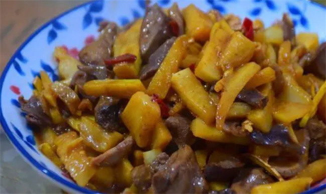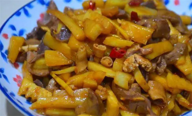 一准备食材: 500克鸡杂、250克酸笋、1块生姜、5个小米椒、5瓣大蒜、1茶匙食盐、2汤匙生抽、2汤匙蚝油、2汤匙陈醋、2汤匙料酒、少许水淀粉。 二、制作步骤: 1、煮鸡杂前,将鸡杂洗净切小块,酸笋也要提前清洗干净,切成均匀大小的小段,放在盘子里备用。然后把小米椒、生姜、大蒜分别切成碎末、丝和薄片,也放在盘子里备用。 2、热锅加油烧热后,小火放入米椒、姜丝、蒜片,炒香后倒入鸡杂,大火翻炒2分钟,让鸡杂炒至7成熟。 3、加入1茶匙食盐、2汤匙生抽、2汤匙蚝油、2汤匙陈醋,翻炒均匀,再放入酸笋,再加入2汤匙料酒,然后再次翻炒均匀,加入半碗清水,盖上锅盖焖煮3分钟左右。 4、焖好后加入适量的淀粉水,大火翻炒收汁,待汤汁浓稠时,即可出锅装盘。
