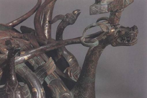 4.制作工艺精湛四龙四凤铜方案并非用失蜡法铸造的,全器各部位为分铸而成,再联结为一体。虽为分铸,但经过精妙的嵌铸和销焊连接,其外观浑然一体,丝毫看不出缝隙。 此外,全器采用了战国时期非常流行的错金银工艺,将铜案装饰得富丽优雅,体现出中山国能工巧匠们青铜铸造工艺之高超。其中,鹿角为嵌铸。有专家认为,鹿是用失蜡法铸成。鹿与环形底座之间用哪焊连接,钢钉从环座里面穿人鹿的胸腔,然后将明钉两头焊死。龙凤蟠绕的结构则使用了多种工艺技法。龙凤之身及中部的彩羽形饰、璧形饰为同范铸成,龙头、龙尾和凤头、凤身间用嵌铸法连在一起,为使颈部连接牢固,颈腔内还灌入焊辙。龙的双腿和双翼哪接。凤的双腿、双翅外段、尾部均辙焊连接。凤腿的焊接是将腿的上端插入体腔内用辙焊铸,以避免发生摇动。龙立于环座上,环座与龙足连接处均设有圆孔,孔中用锵焊将二者固定在一起。龙头与蜀柱的连接,在蜀柱下端有椭圆形棒,龙头上部有长方形梅槽,棒人槽后浇人焊辙固定。器上错金银的花纹沟槽,从环座鹿身连接处未曾镶嵌金银丝的部位观察,应为模铸而戚,沟槽铸成后再加工使之符合镶嵌的要求。 据学者统计,该器物是由78 个部件,以22 次铸接(36 个接点) ,48 次焊接( 56 个接点)成形的,共计使用了188 块泥范、13 块泥芯。从整体造型来看,这件铜案结构繁复而严谨,显示了中山国工匠卓绝的工艺构思和技巧。