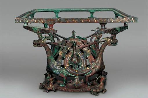 1.文物简介1977年河北平山中山王墓出土,现收藏于河北省文物研究所。长47.5 厘米,宽47 厘米,高36.2 厘米,案面已朽,仅存铜质方案座。案座底盘为圆形,由两雄两雌四只跪卧的梅花鹿承托,上面昂首挺立着四条双翼双尾的神龙。龙的双翼在内部中央聚合成半球形,双尾向两侧环绕,反勾住头上的双角。龙尾盘绕处连接四只展翅的凤鸟。四条龙的龙头分别托起一件一斗二升式的斗栱,斗栱托起案框。斗栱是按照当时木构建筑的挑檐结构设计而成,是我国迄今发现最早的战国时期的斗栱应用实例。案框一侧有铭文:“十四祀,右使車(厙),啬夫郭、工疥。”