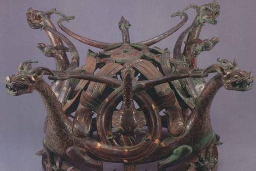 3.造型精美别致从造型艺术来看,此铜案的主体造型是四条龙、四只凤扭结缠绕形成的半球状的镂空结构。整件铜方案由案面、底座和方形案框三部分组成。出土时,漆制案面已朽。 底座下部有两雌两雄四只梅花鹿等距环列,有四只横卧的梅花鹿,四肢曲卧于一圆形环底座,鹿身装饰斑纹,四肢蜷曲,神态温驯 。中间分别于弧面上立有四条独首双尾龙,龙身各蟠绕一凤,四条神龙挺胸昂首,分向四方,与案角形成一条弧形内收的轮廓线。相邻两龙蟠环交结处,均有长钩状彩羽形饰与中间璧形饰成拱状连接。龙尾蟠环纠结之间四面各有一只凤鸟,引颈长鸣,展翅欲飞,头顶有花冠,凤身饰羽毛纹饰,生动华丽。