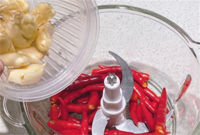 接下来处理蒜蓉,同处理辣椒一样,将蒜头装到料理机中七分满,使用点打的方式将蒜头搅碎。 将搅碎的蒜蓉倒入辣椒酱中,放入盐、糖、鸡精和高度白酒。 将两者混合均匀后,让它们在旁边静静等待。 将瓶子用热水冲洗干净晾凉,将做好的辣椒酱倒入罐中密封保存,一个星期后就可以开封享用了。 蒜蓉辣椒的制作过程虽然简单,但其味道却非常美味。如果你喜欢吃辣,不妨试试自己动手制作一下这道美味的蒜蓉辣椒,让你的味蕾在秋冬季节也能感受到满满的幸福。