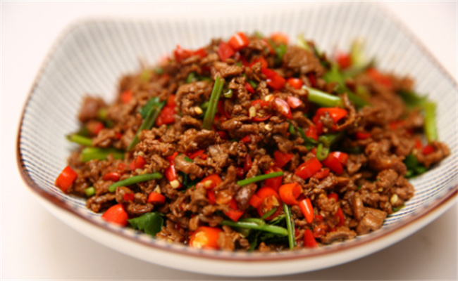 1.选料与准备 选择新鲜的牛肉,肉质鲜嫩,无腥味。将牛肉切成厚度约为3毫米的片状,再将牛肉片放入碗中,加入适量的料酒、盐、黑胡椒、淀粉,搅拌均匀后腌制10分钟。此步骤的目的是使牛肉更加嫩滑,口感更好。 2.烹饪 (1) 热锅凉油,将腌制好的牛肉渣放入锅中,用中火煸炒,直至变色。 (2) 加入洋葱、青椒等蔬菜,翻炒至蔬菜变软。 (3) 加入适量的生抽、老抽、料酒和白糖,炒匀。 (4) 将热水或高汤倒入锅中,稍微加大火力,快速翻炒,至汤汁收干即可。