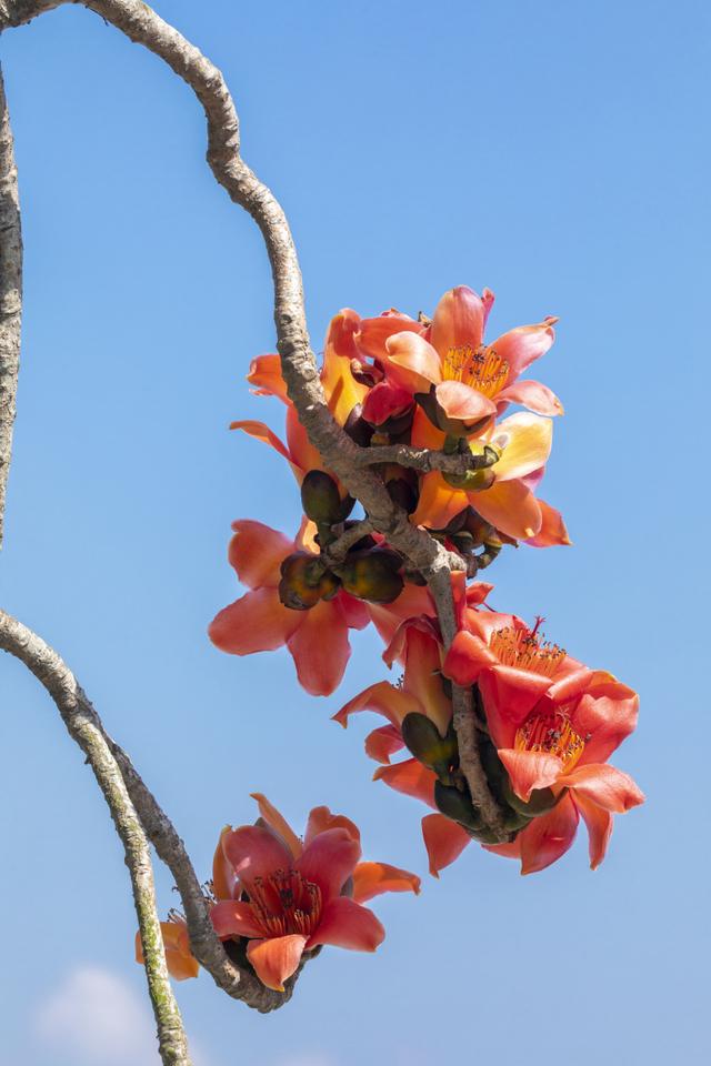 木棉树象征什么,什么时候开 木棉,中文别名红棉、英雄树、攀枝花,是南方常见的观赏树木。它在每年的早春时节开花,花朵大而鲜艳,是城市道路、公园和庭院的重要绿化材料。木棉树属于落叶大乔木,树冠呈伞形,树干直立,分支点较低,树皮粗糙呈灰色,枝条向周围伸展,叶片手掌大小,形状呈椭圆形或卵形,花朵有五片花瓣,花色包括红色、黄色和白色等。