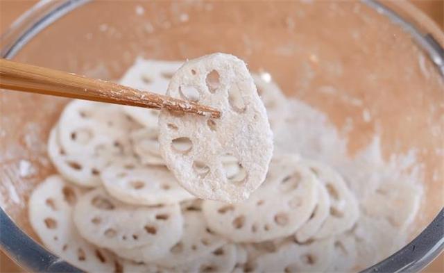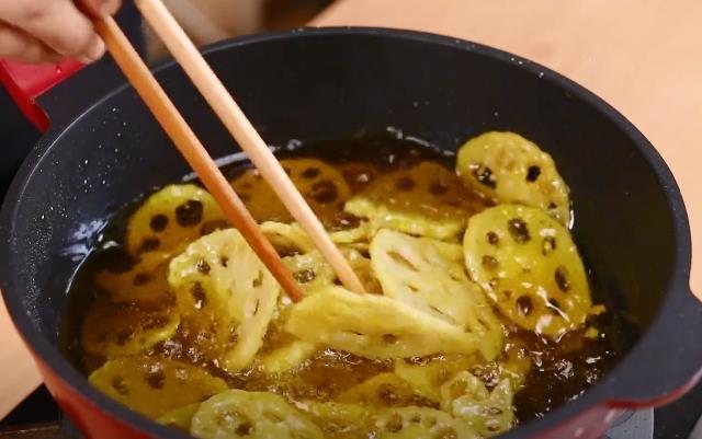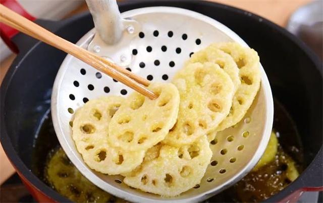 3.炸藕片的油温不能太高,我们控制在四五成热就要下锅,头一次炸的这个颜色不用太深,只需要表皮稍微有点变硬的程度就能出锅了。来源: www.ws46.com