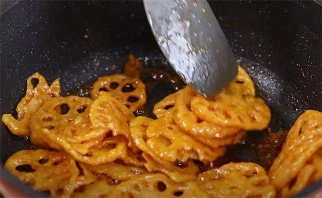 5.锅里留一点底油,倒上一包糖醋料汁,熬到起泡的程度就可以放藕片了,稍微翻炒均匀即可出锅。
