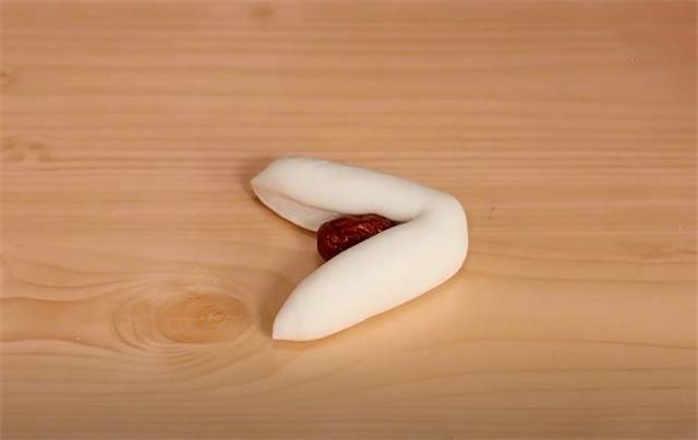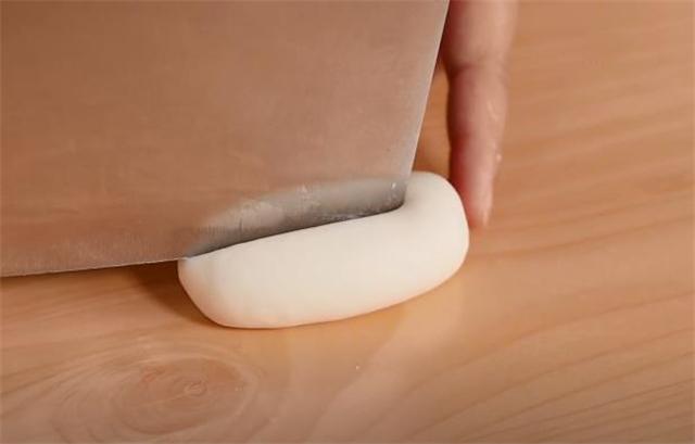 3.切完面剂子之后就可以开始做造型了,先简单的揉到匀称的状态,搓好之后我们从中间切开,注意这个顶部的位置不要切断。