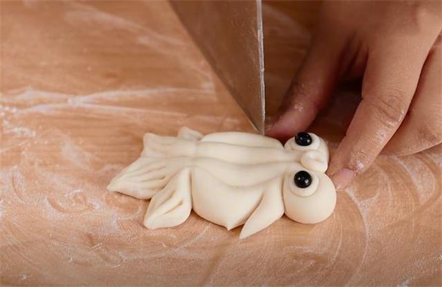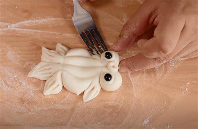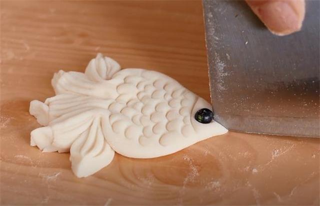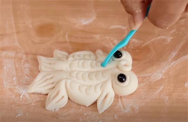 26.鱼鳃的部分直接用勺子压出来,点上一颗黑豆,再压出来鱼鳞,至于嘴巴的部分,我们直接在这切一刀。