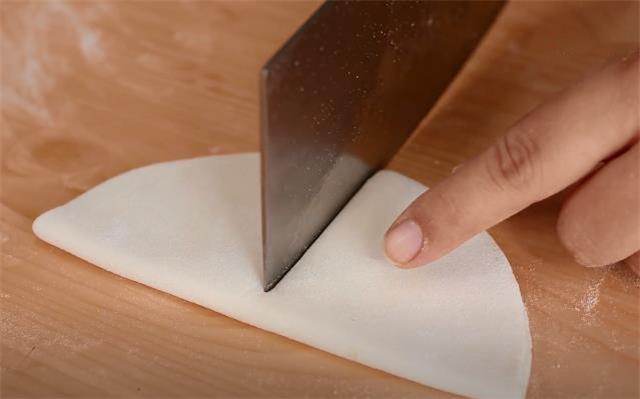 2.擀成圆形的面片之后我们先对折,在中间的位置切上一刀,注意顶部的位置别切断。