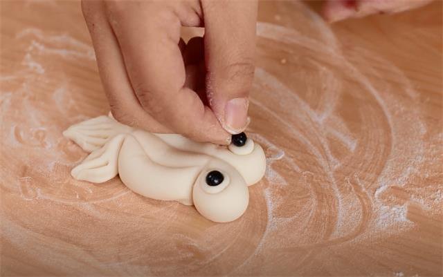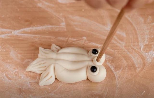 18.嘴巴的做法就更简单了,还是放上小圆球,用筷子尖往下戳。