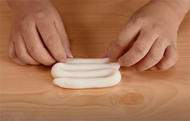 11.我们来分享第二种做法,长条搓好之后我们先对折,然后再次对折一次。