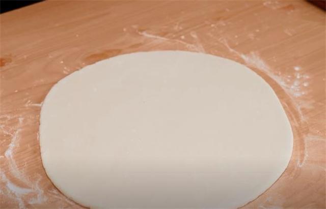2.案板上撒些干面粉防粘,这个饼皮擀多大取决于自己的喜好,最终它决定了一个整体的大小。