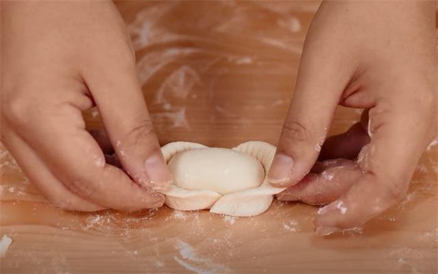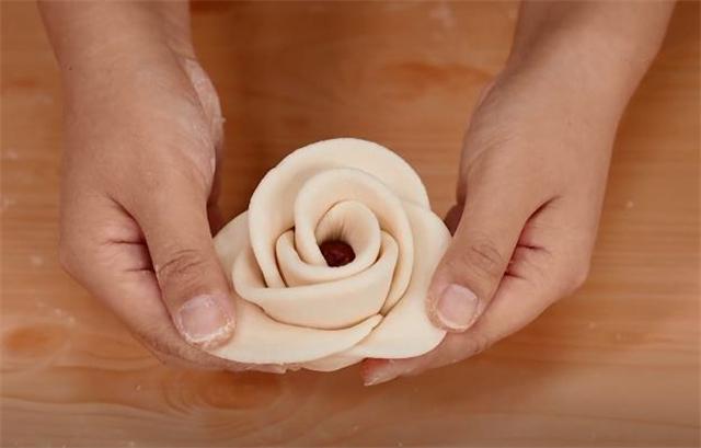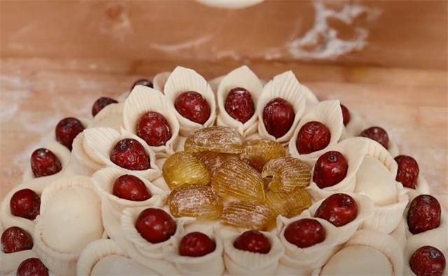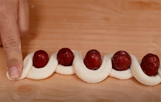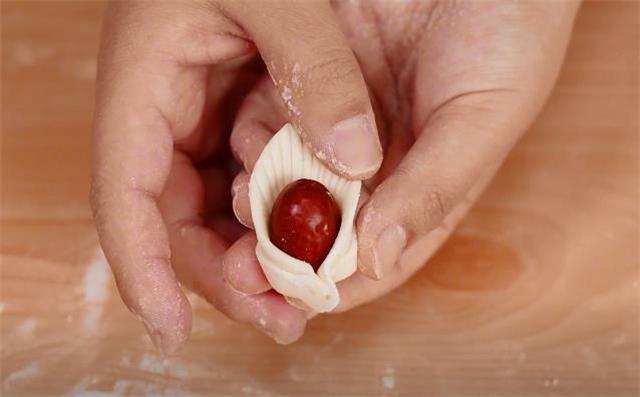 13.中间的位置放上红枣,两端的收口中捏在一块,这个花瓣的造型就出来了。