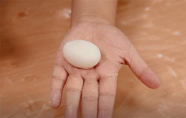 6.接着取出来一个比较小的面剂,充分的揉匀,稍微的搓一下搓成胖乎乎的圆柱形。