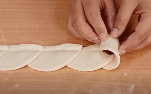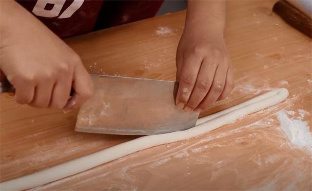 3.再取出来一小部分面剂我们做花边,搓完长条直接从中间的位置对半切开,注意这个顶端的位置别切断。