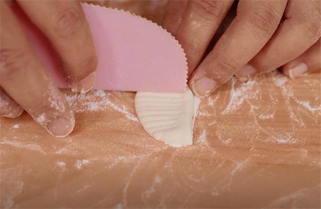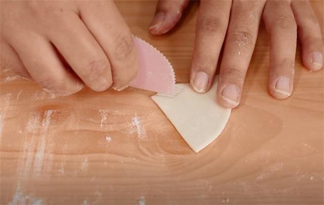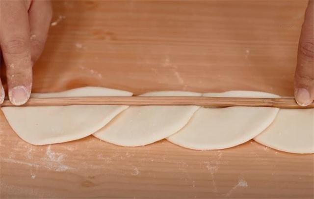 7.再拿一个比较小的剂子按扁,用擀面杖擀开,然后对半切开,拿个工具压出来竖条纹,如果家里面有梳子的话会比较方便。