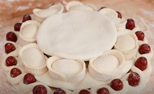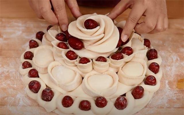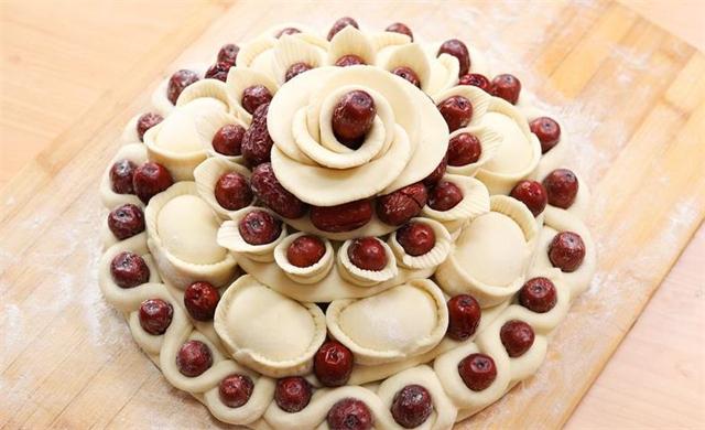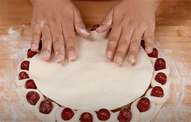 5.周围的花环做好了,我们在中间的位置铺上蜜枣,再擀一个小面片去覆盖住这些蜜枣。