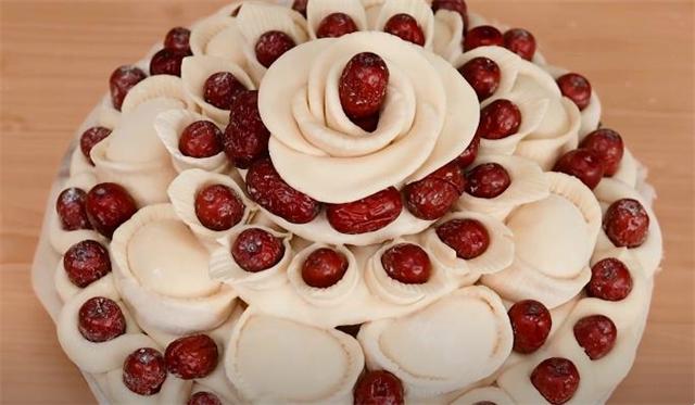 19.把这个花瓣摞上去,我们这个枣糕的造型就整体的出来了,在这个花朵和底盘的中间位置,我们再放上一圈红枣。