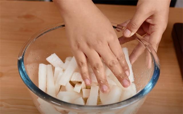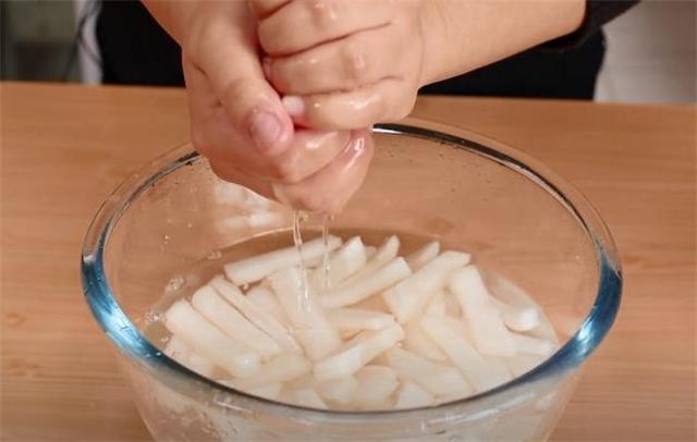 3.时间差不多到了,萝卜条腌好之后,会变得软软的,而且会吸出来很多的水分,继续用清水多清洗几遍,来去掉它的辛辣味,清洗完之后用手挤去多余的水分,这样吃起来的口感会比较酥脆。