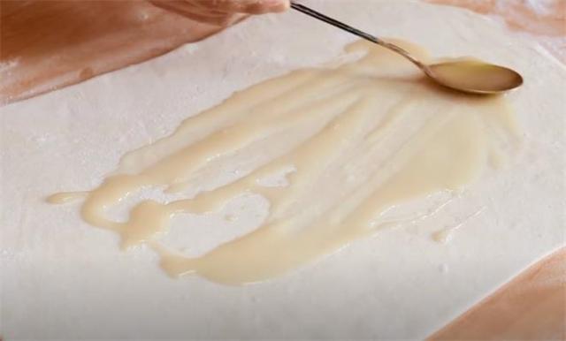 5.擀好了表面上抹一层油酥,油酥有助于分层,油酥的做法很简单,30g面粉加50g食用油搅拌即可。
