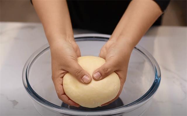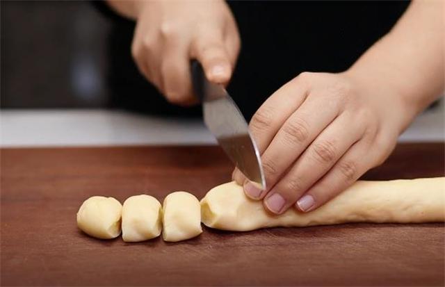 2.面团完全的松弛好之后,它会比刚才更加的柔软,这时候我们直接搓成长条,这个剂子太大了,我们用刀从中间切开,然后再次搓成长条,再切成一个一个比较小的剂子。