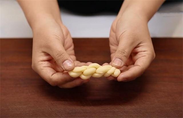 4.然后捏住一端,这一端再继续旋转,再次提起来把它们缠绕在一起,我们这个麻花就做出来了。