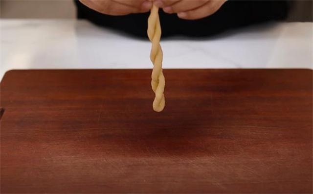 3.面剂子简单的搓几下揉均匀,然后直接搓成细长条,搓好之后我们双手往反方向再搓一下,捏住两端提起来它就会缠绕在一块。
