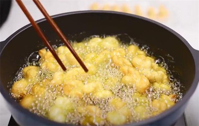 5.所有的剂子做好之后,油温六成热开始下锅炸,刚下锅之后麻花遇到这个足够的油温,它就会迅速浮起来变得膨胀,这时候我们再转中小火慢炸。