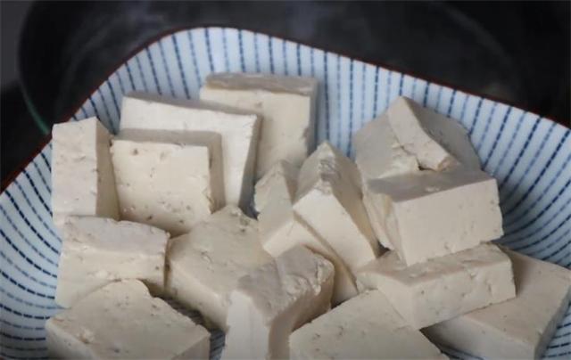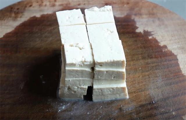 2.然后准备一块豆腐,将豆腐全部切成小片,豆腐营养丰富,含有铁、钙、磷、镁等人体必需的多种微量元素,以及丰富的优质蛋白,素有“植物肉”之美称。