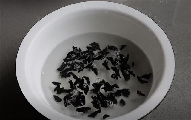 1.提前往盆里加入一小把的干木耳,再加入热水进去,将干木耳泡开。